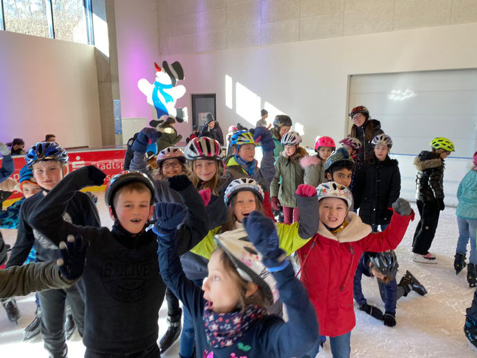 Auch in diesem Jahr freuten sich die Dritt- und Viertklässler wieder besonders auf den Freitag nach den Halbjahreszeugnissen, denn das hieß: Alle Mann nach Kaiserslautern auf die Eisbahn! Als gegen neun Uhr der Eintritt bezahlt war, ging es endlich los. Schnell wurden mitgebrachte oder geliehene Schlittschuhe, Handschuhe, Helme, Schals und Anoraks angezogen und schon stürmten alle gespannt aufs Eis. Zu modernen Sounds der aktuellen Charts drehten Kinder und Lehrerinnen Runde um Runde. Auch Anfänger kamen mit Hilfe von „Pinguinen“ und „Eisbären“ sicher und souverän über das Eis. Nach einigen Runden Spaß lockten dann der Duft von Crépes und Waffeln alle vom Eis- da wurden auch zehn Minuten Anstellen gerne in Kauf genommen! Selbstverständlich wurde zusätzlich auch der mitgebrachte Proviant von zu Hause aus dem eigenen Rucksack nach weiteren Runden Eislaufen gerne verspeist. Als gegen zwölf Uhr alle Katzweilerer Kinder die Eisbahn verließen, blickten alle auf einen schönen, erlebnisreichen und zum Glück unfallfreien Ausflug zurück.