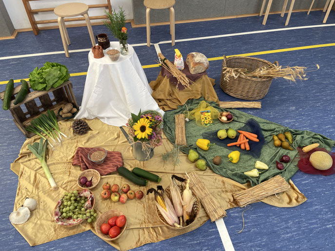 Auf einem Gabentuch waren viele verschiedene geerntete Früchte platziert, so dass alle Beteiligten schon beim Eintreten in die Turnhalle auf das Erntedankfest eingestimmt wurden. Gestaltet wurde der Gottesdienst von unserer katholischen Religionslehrerin Frau Resch.