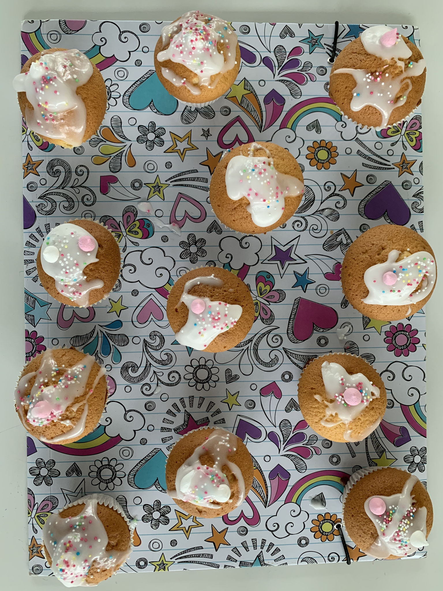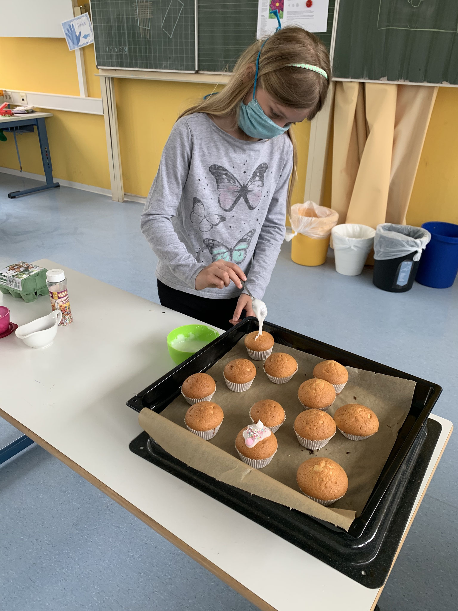 Muffins backen mit Eiern von eigenen Hühnern einer Viertklässlerin stand als nächstes auf dem Programm: 3 Mädchen aus der 4, 3 Arbeitsschritte, 12 kleine Kuchen- eine prima Ausbeute fürs Frühstück in der Notbetreuung oder?!