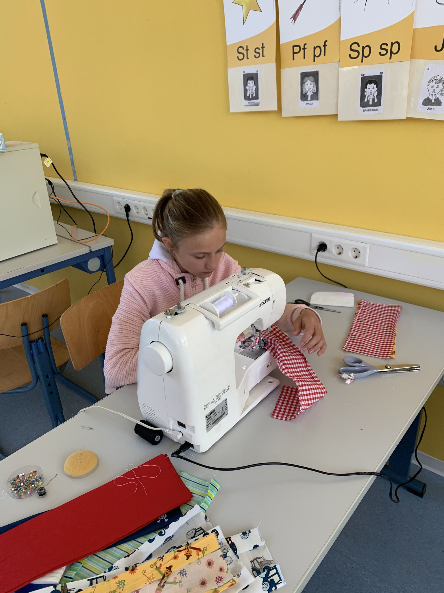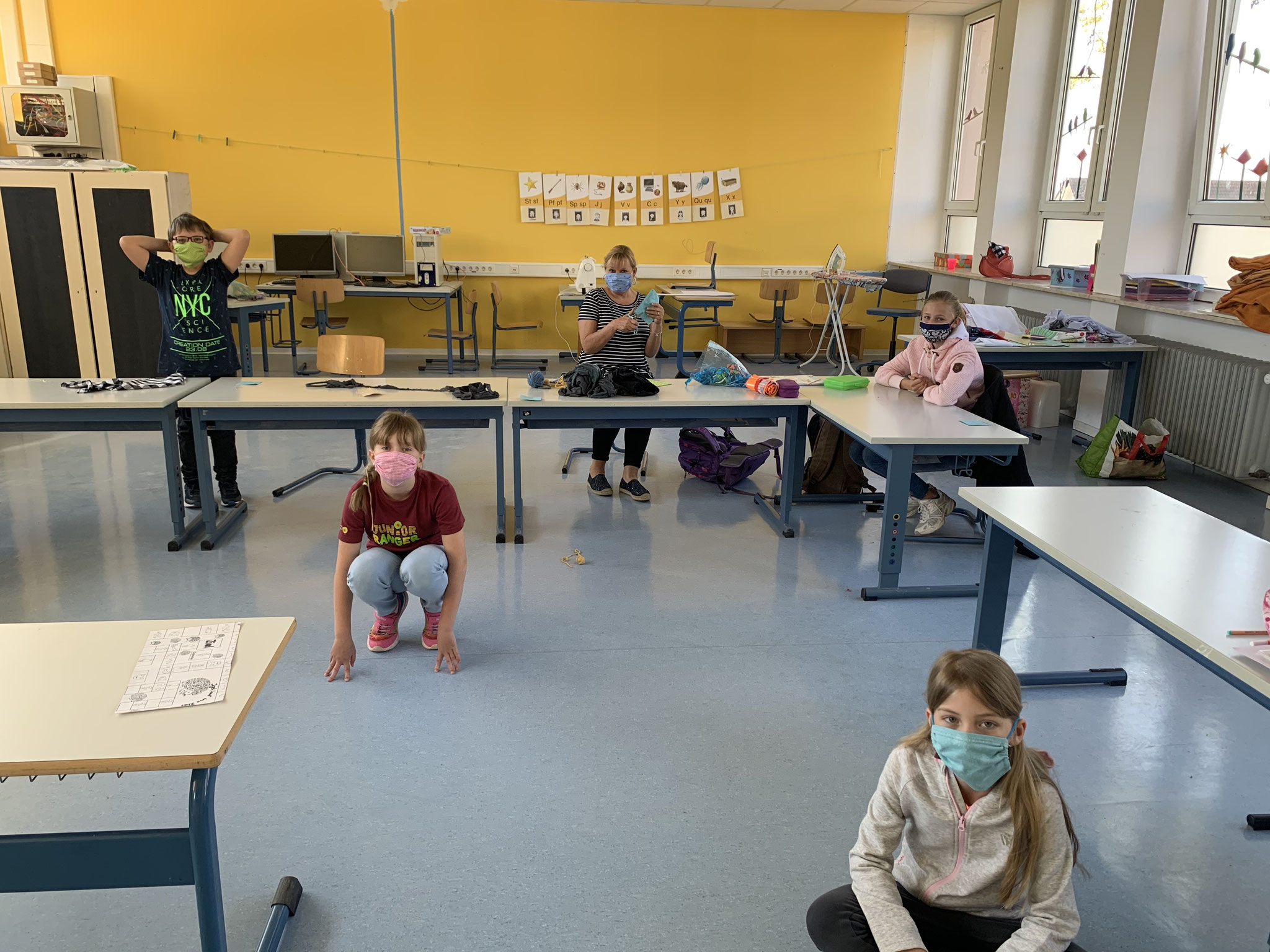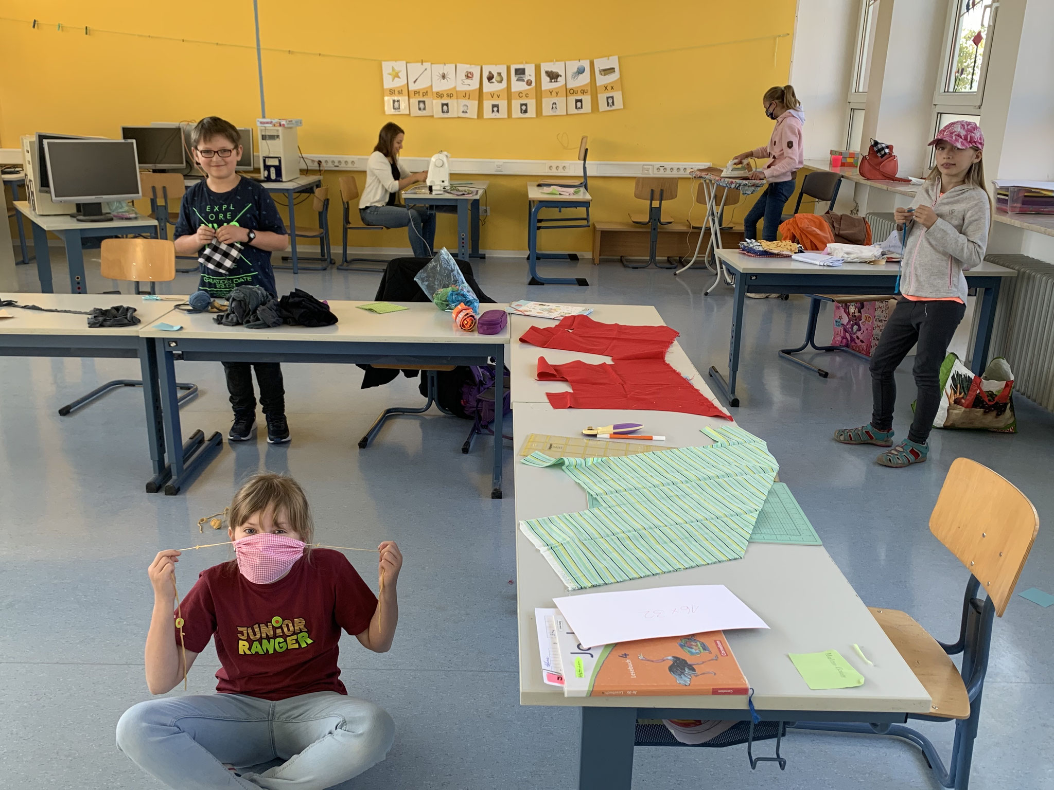 Als Erstes haben unsere 5-6 Kinder mit Hilfe der jeweiligen Lehrkraft Masken genäht- 72 Stück!!! Die sind in erster Linie für Klassenkameraden gedacht, die noch keine haben- und als Notreserve, falls mal jemand seine zu Hause vergessen hat. Sollte jemand aus Katzweiler aber noch Bedarf haben, kann er sich telefonisch bei uns in der Schule melden! (06301-2391)
