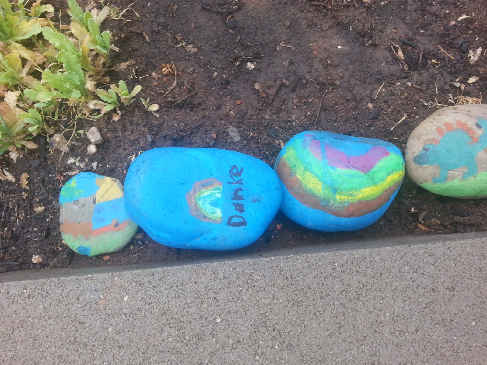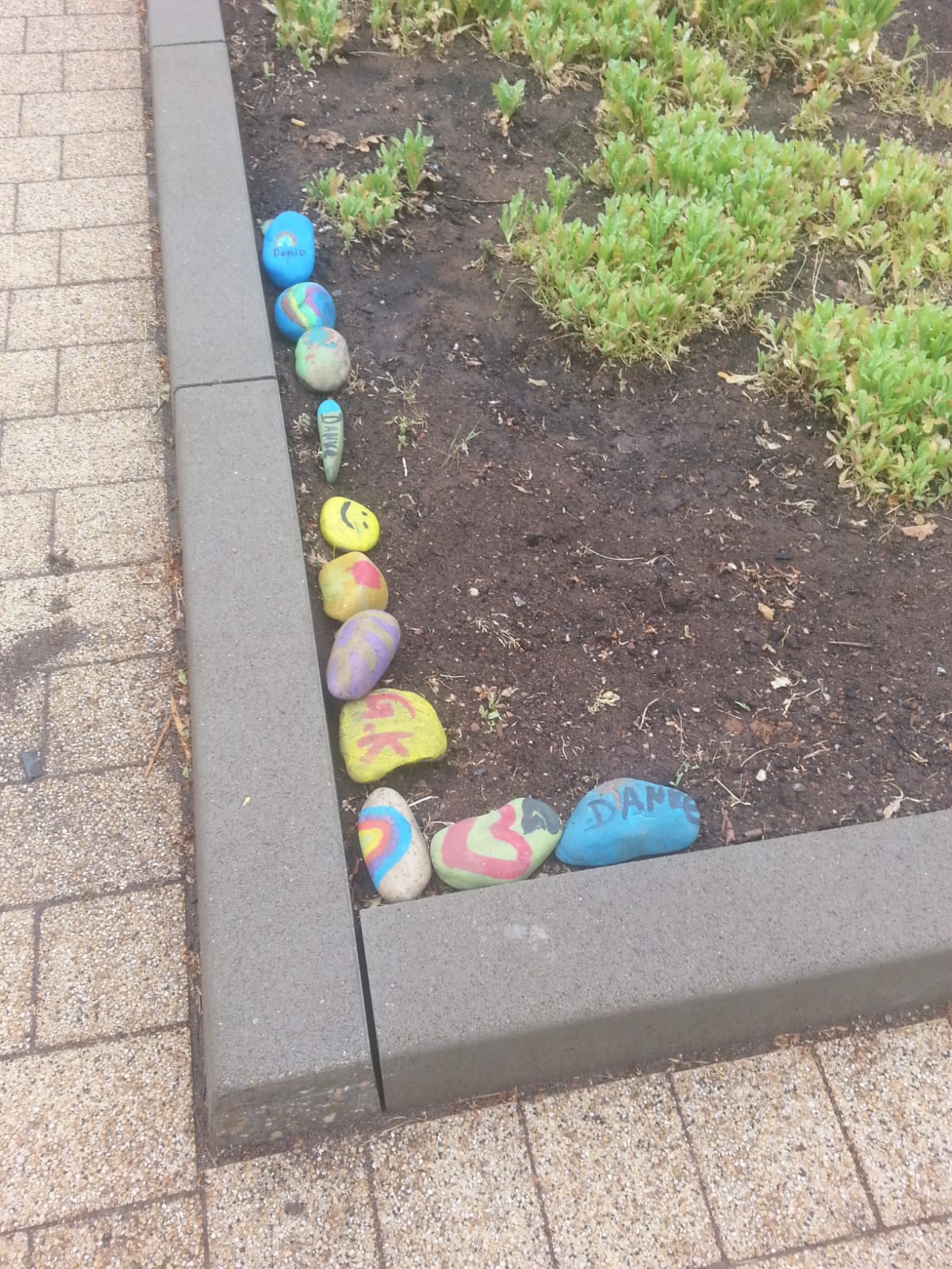 Und schlussendlich wurde das Blumenbeet vor der Schule mit bunten Blumensamen eingesät und mit ersten, bunt bemalten Randsteinen gesäumt. Es wäre toll, wenn vielleicht Kindergartenkinder, Senioren oder andere Künstler hier bei uns in Katzweiler, die etwas Langeweile haben, einen bemalten Stein dazulegen!!!???